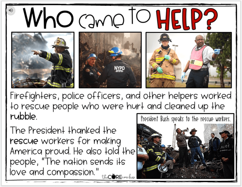 2. 9/11 with light focus on the terrorist event, and heavy focus on national unity and community helpers.
