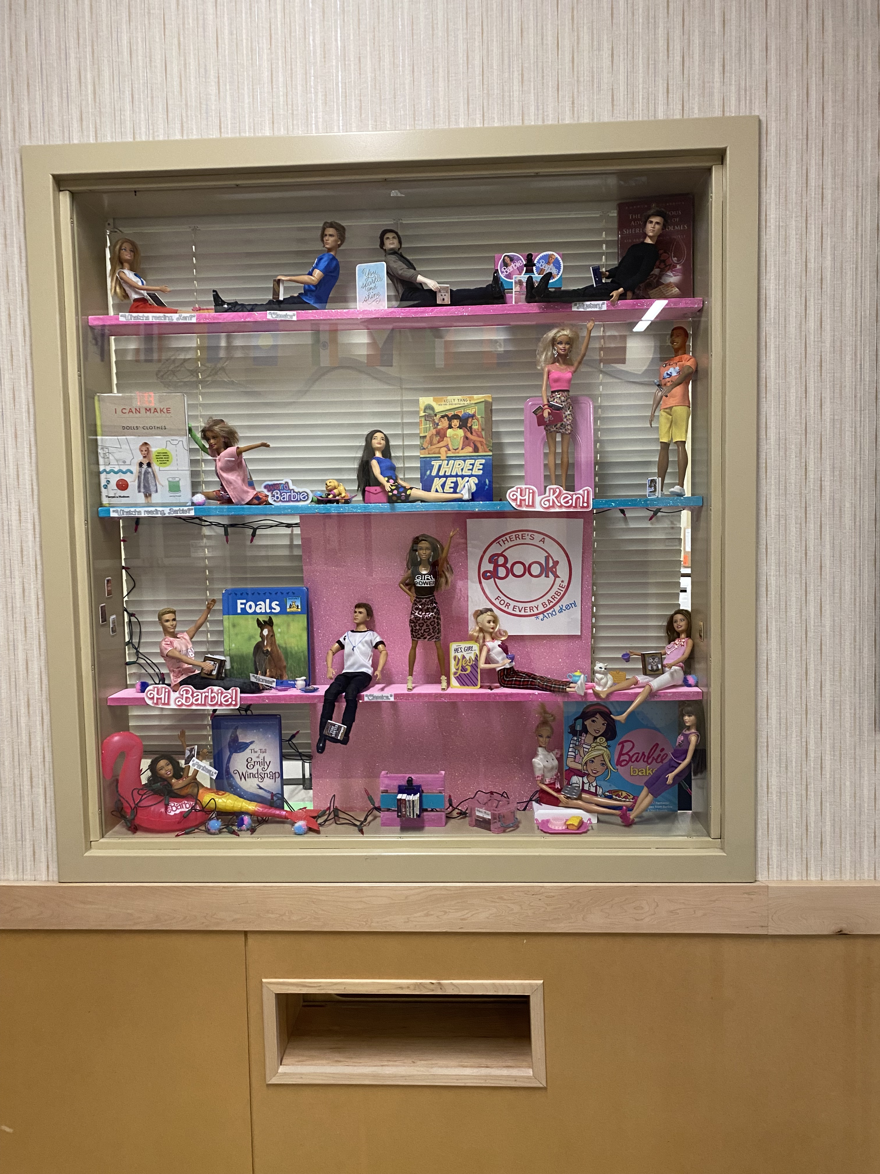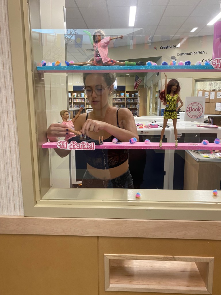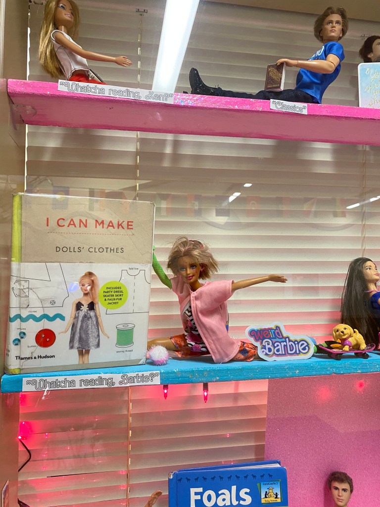 Sophia hard at work creating a displayEach Barbie and Ken has a book. The Classics!With pink lights! Professions to make them feel more than Kenough.Everyone has a Weird Barbie.