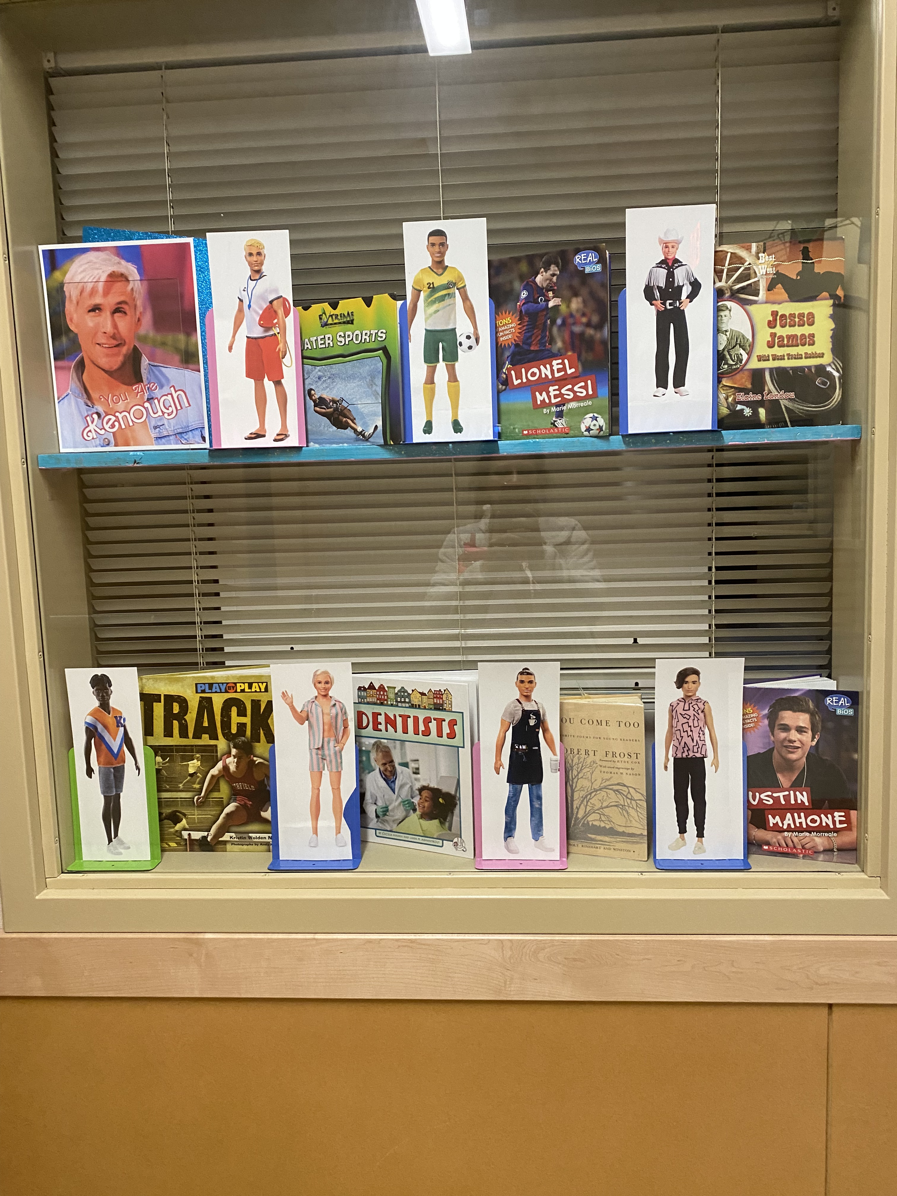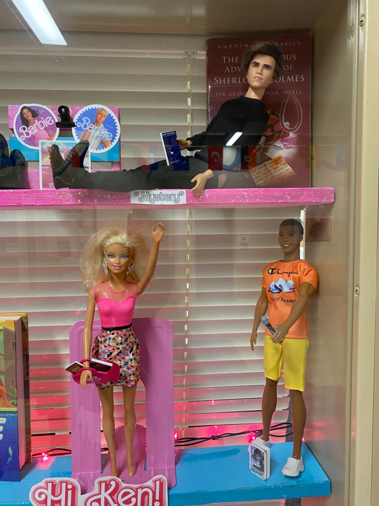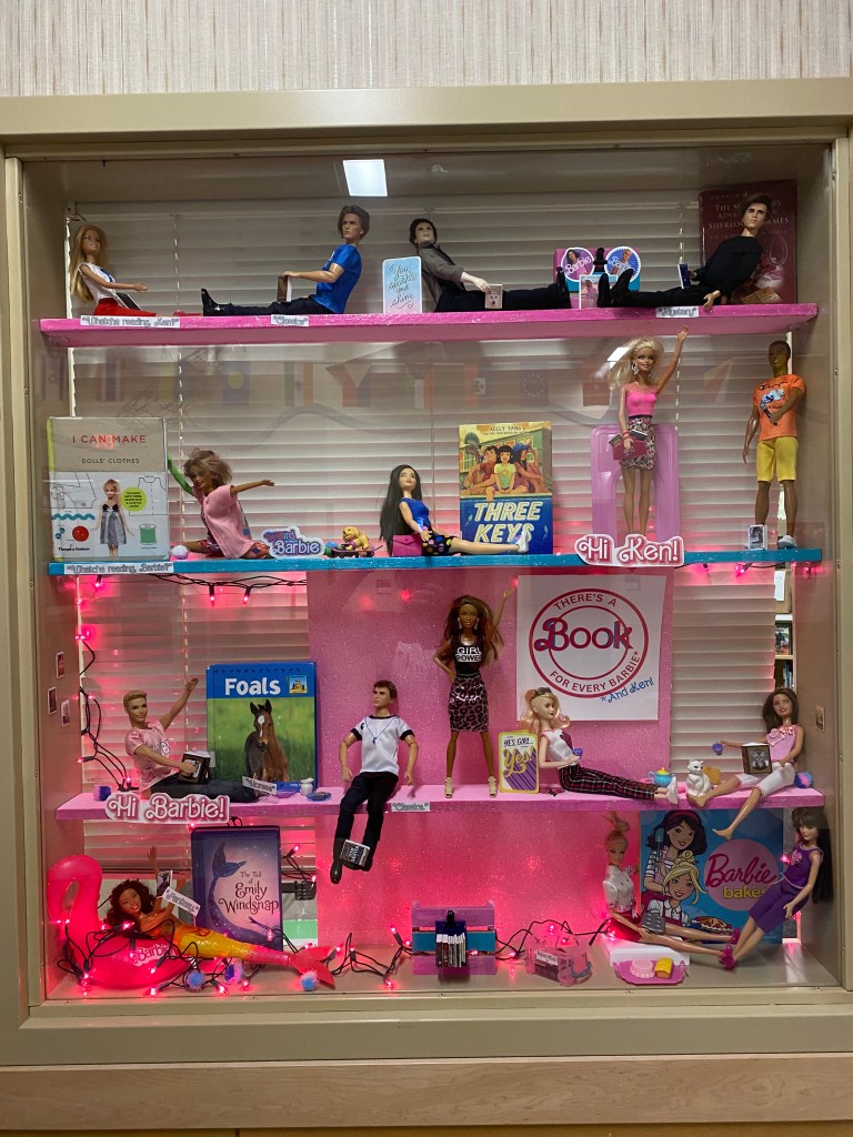 Not that many of our students have actually seen the movie, (the intended audience being adults and teens) and that’s fine. Those who have, adored it, and usually had older siblings. But the display was carefully created by my 18-year-old daughter, who, with impressive imagination, played Barbie and Monster High with her twin sister for much longer than their peers. I played along with them of course, which is why I sobbed through much of the nostalgia-driven scenes. Also, my daughters are leaving me for college so I’m a little weepy anyway.