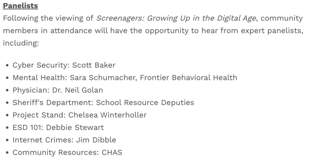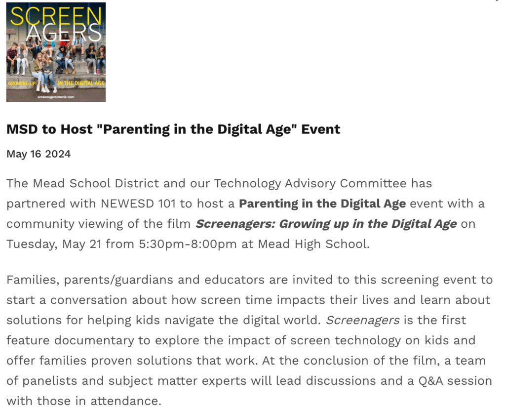 Please work to attend the very important event centered around the documentary, “Screenagers” at Mead High School on May 21, 2024.